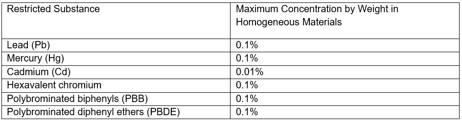 The table below is the complete list of all substances restricted under the EU RoHS Directives (RoHS 2 and RoHS 2+) and their corresponding maximum concentrations.