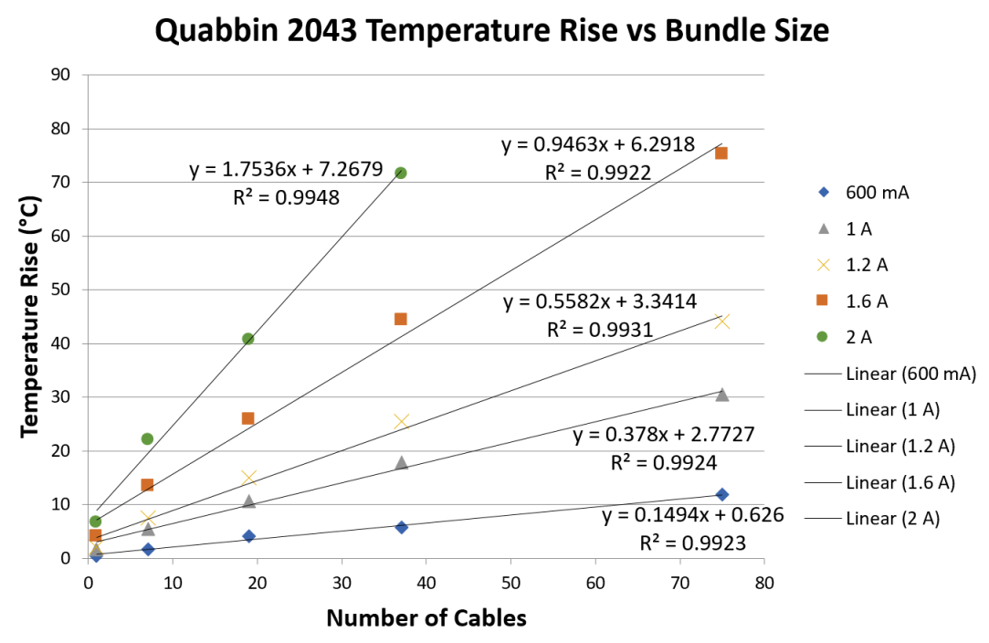 From the data generated by these tests, Quabbin derives trend lines for temperature rise versus number of cables in a bundle at various current levels. From these trend-line equations, the maximum bundle size for a desired maximum temperature rise can be calculated. This is accomplished by choosing the trend-line equation for the required current level, inputting the desired temperature rise as the y-value and solving for the x-value. The x-value is the number of cables in a bundle that will raise the bundle temperature by the amount specified at the given current level.