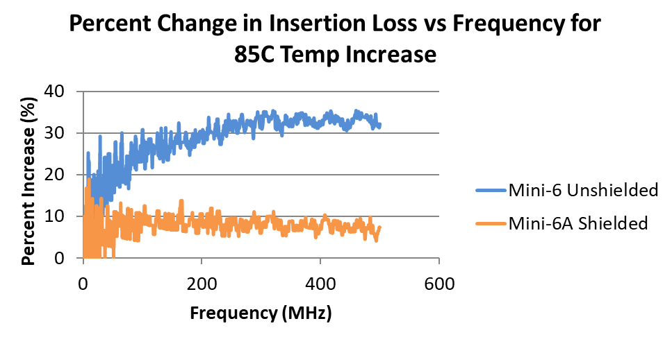 Quabbin has also performed testing on cable performance over temperature on several of their constructions.  Terminated assemblies are placed inside bundles of cable and a thermocouple is used to monitor the temperature in a cable next to the assembly.  Handheld testers are used to measure cable performance at different temperatures and this data is compared to room temperature cable performance.  This measurement was performed the Mini-6 unshielded and Mini-6A shielded cables.  The results of this measurement are shown below: