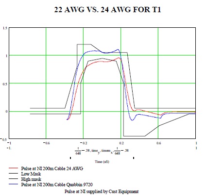 Quabbin offers T1 cable in 22 AWG which is a heavier gauge than most category cables which are usually 24 AWG. Insertion loss on a 22 AWG cable is approximately 25% lower than that measured in a 24AWG cable. This leads to more distance. Quabbin's 9720, 22 AWG cable can meet the required T1 pulse mask at a full 200 meters rather than the approximate 150 meters from a 24 AWG cable.