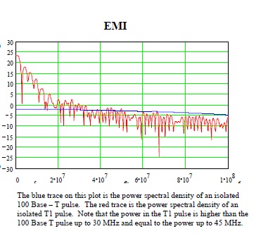 Cross Talk is the phenomenon seen within a cable when the signal from internal wires jump over to other internal wires and present as EMI. Cross talk is most prevalent at the end nearest the transmitter where the signal is the strongest. The official name for this type of cross talk is Near End Cross Talk (NEXT). NEXT interference affects system performance by creating link errors which lead to multiple re-transmissions which `steal' network bandwidth and lead to a degradation of network speed/throughput. The problem with massive re-transmissions is that you may never know its happening. Network users will notice the performance is sub par, but they may never realize why. The most common knee jerk reaction is to upgrade the network, but to no avail. Cross talk phenomenon is well known in the network world and UTP category cables have been designed to eliminate these problems so UTP (unshielded twisted pair) Category cables can successfully be used for Ethernet. The question that begs to be answered is why is this cable `OK' on an Ethernet network and `no good' for a T1 extension? Well, it comes down to an easy answer that most installers either don't realize or have forgotten….Power. The mistaken assumption is that the data rate for T1 is lower than Ethernet, so everything will be fine. Even though the data rate for T1 is lower than Ethernet, the voltage in a T1 circuit is 300% greater. Yes, where Ethernet operates at 1 volt peak to peak, a T1 signal gets banged out at 3 volts peak to peak. The reason the T-carrier signals use the higher voltage is because they were designed to drive the signal thousands of feet between poles, not hundreds of feet on an internal network. T1 circuit designers never meant for T1 signals to run over UTP cable because they knew it would leak emissions. Now add to the equation a cable that was designed and regulatory tested for emissions at only 1 volt and you can see the problem. Further, the `power spectrum' (power at each frequency) is different in a T1 circuit than it is in an Ethernet circuit. (see graphs below) In a T1 circuit there is more power available at high frequencies because of the higher voltage. Additionally, T1 switches can be very noisy. In fact, in the early days many T1 switches could not pass FCC testing for emissions without the use of shielded cables. With this information in mind it's easy to see why more emissions will radiate out of a category cable running a T1 signal than may have initially been expected.
